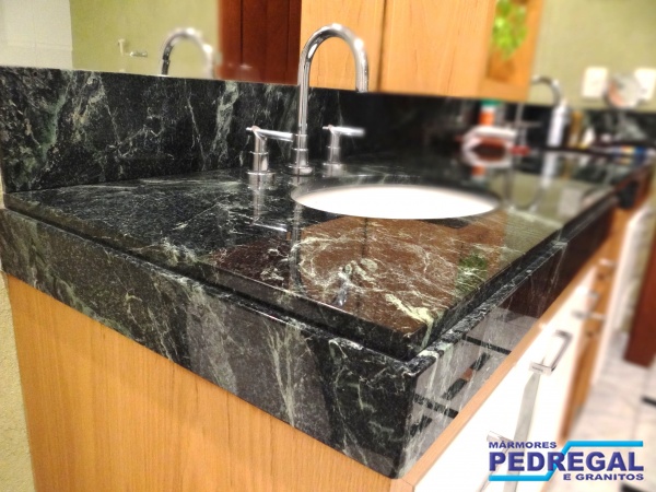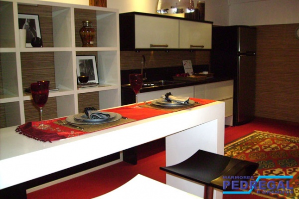 Bancada em Marmoglass, com acabamento em 1/2 esquadria